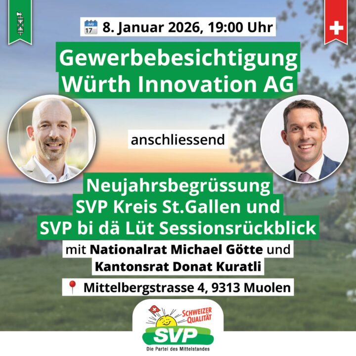 Am Donnerstag 8. Januar 2026 um 19.00 Uhr laden wir herzlich zur Gewerbebesichtigung der Würth Innovation AG in Muolen ein. Im Anschluss findet die Neujahrsbegrüssung der SVP Kreispartei St.Gallen mit einer SVP bi dä Lüt Session und Sessionsrückblick statt. Nationalrat Michael Götte und Kantonsrat Donat Kuratli werden dabei die wichtigsten politischen Themen einordnen. Der Abend endet mit einem Apéro und der Möglichkeit zum persönlichen Austausch.